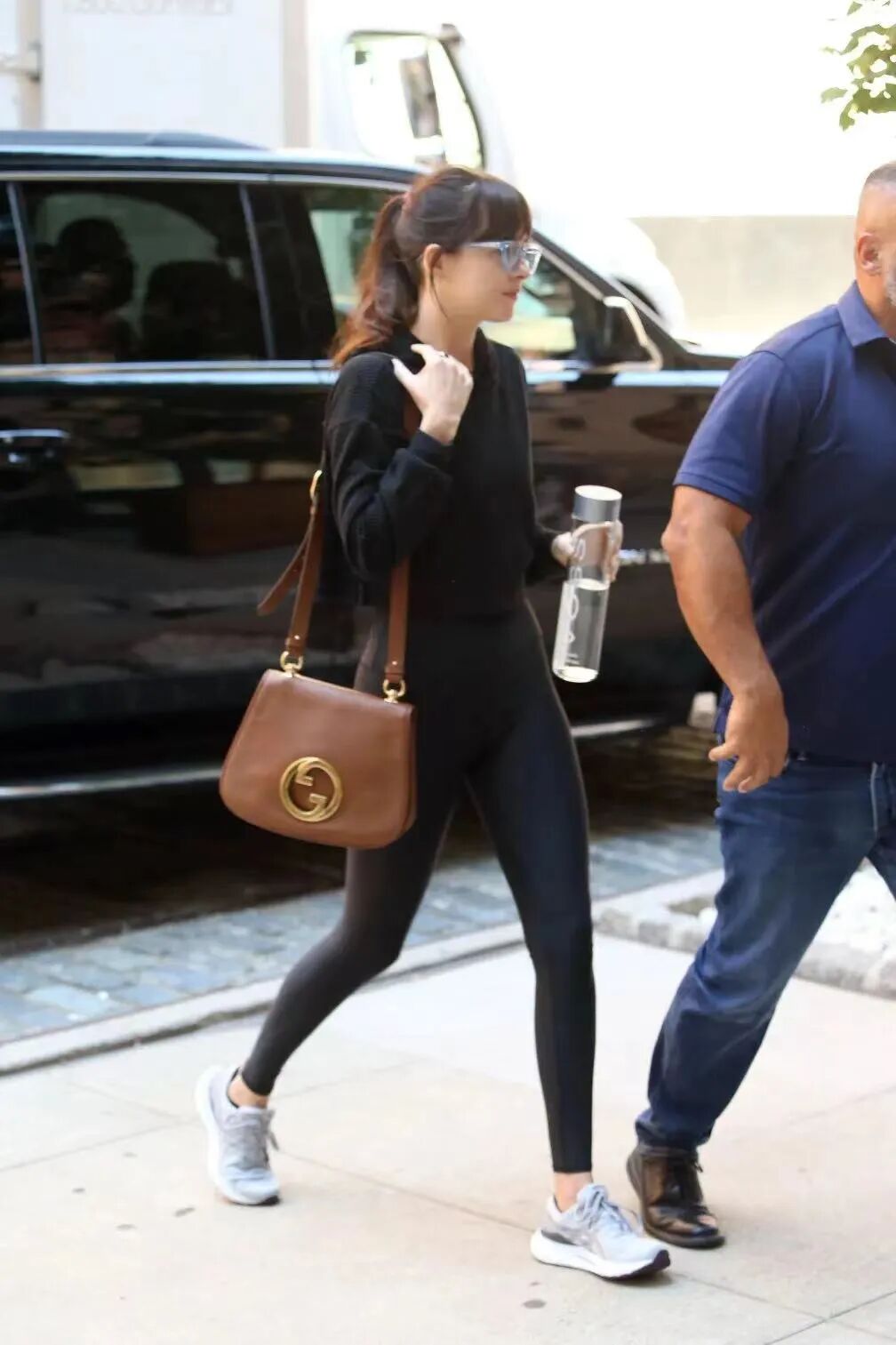 Dakota Johnson选择的是皮革肩带款,复古咖色实在日常百搭,有皮革的高级质感加持,一身基础款也能保持时髦度。