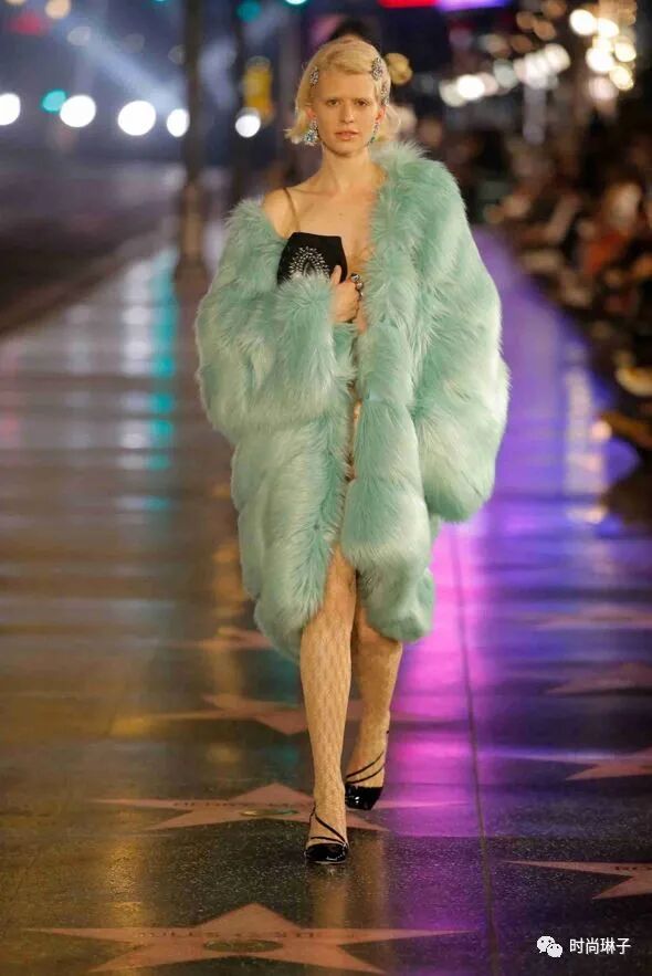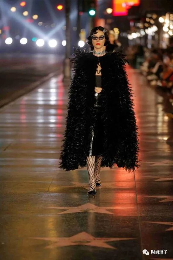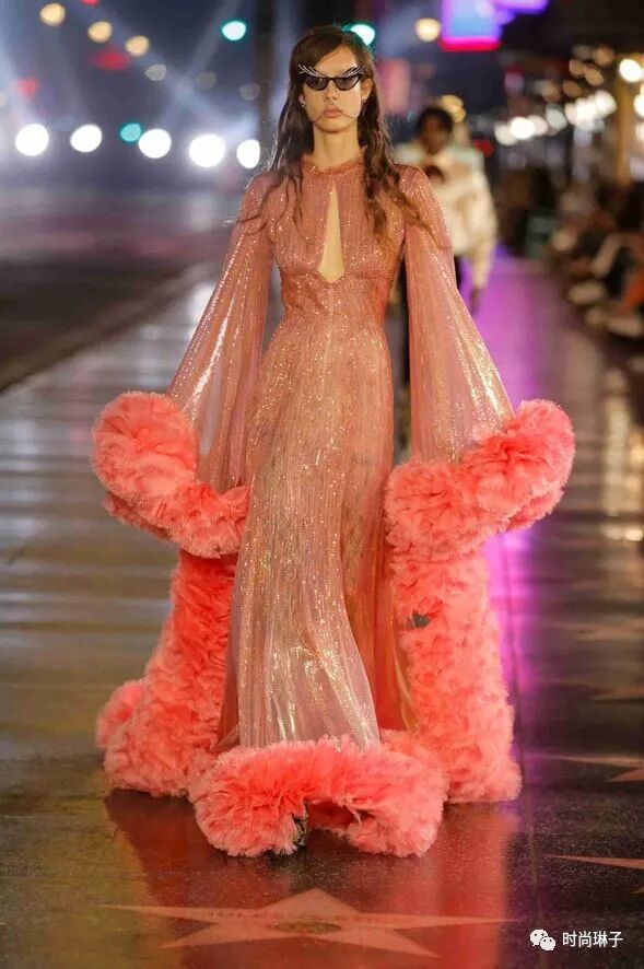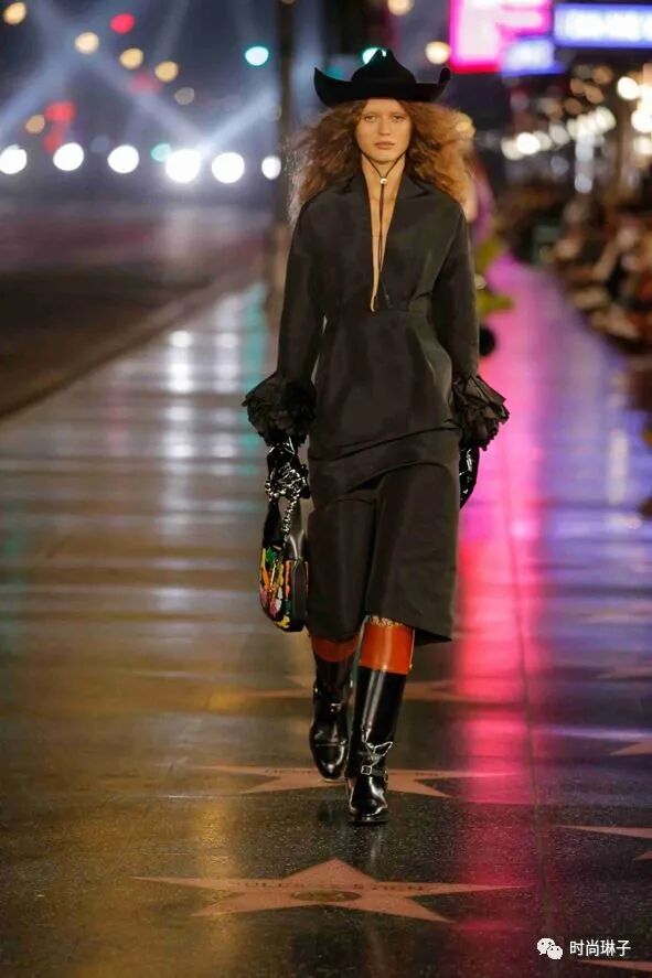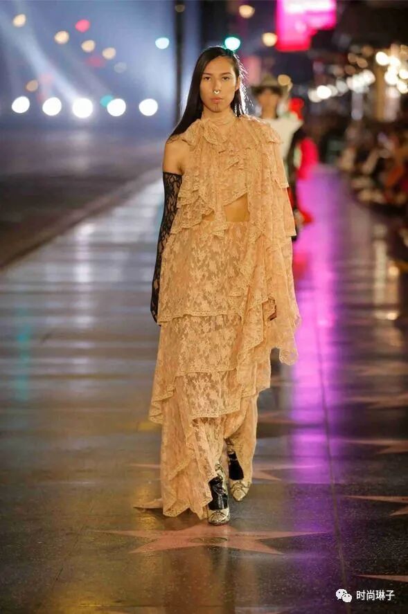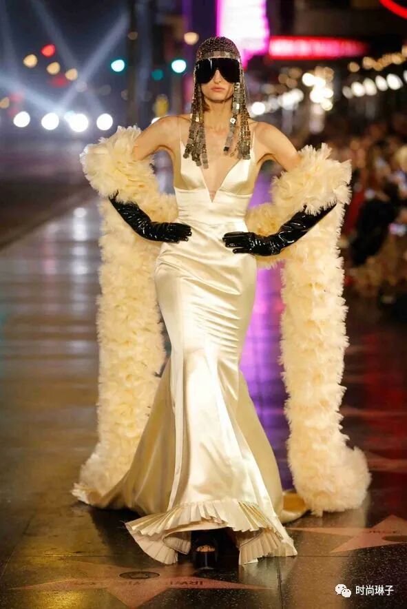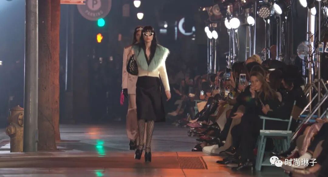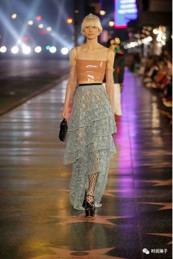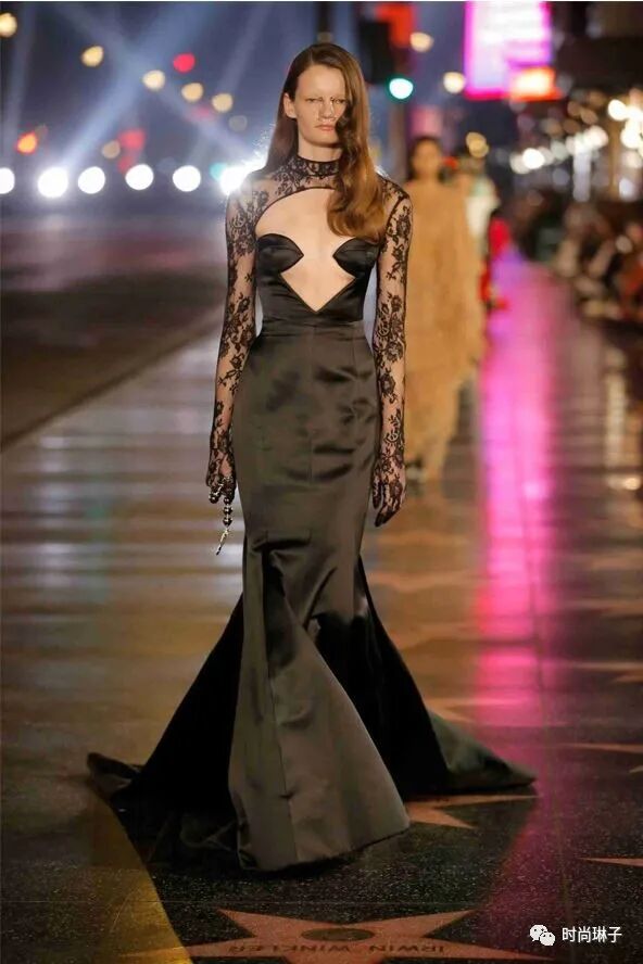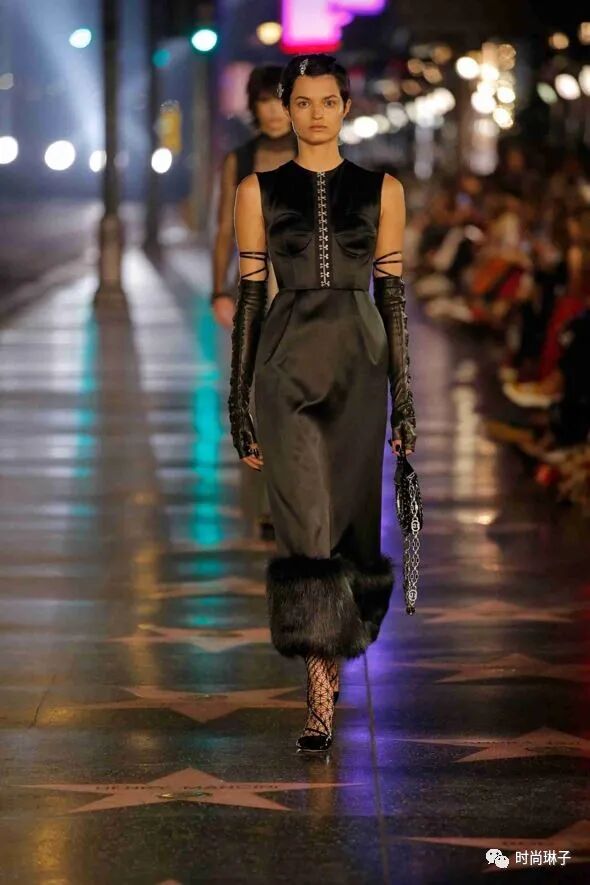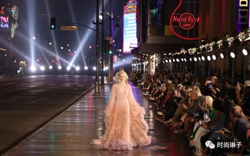 该季模特从好莱坞大道著名的中国剧院TCL Chinese Theater 走出,为这场户外大秀拉开序幕。