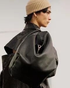 复古式丝巾不仅可以系在包包上,此处还摇身一变成90年代风格拼接牛仔裤的装饰,未剪裁的裤裙长长地拖着地,搭配橄榄球衬衫,露出腿部白色的袜子;超大复古设计女装包带有汤姆福特时代硬件,你还可以看到经典的马衔扣乐福鞋。