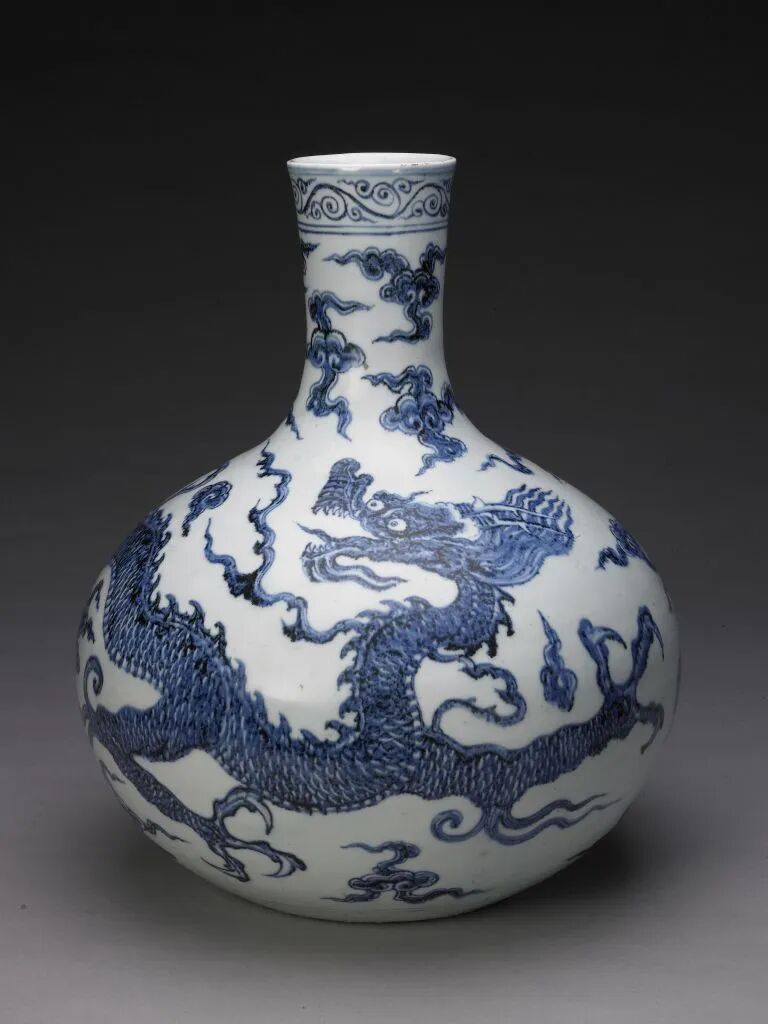 天球瓶是受西亚文化影响极深的一种瓷器造型,创烧于明代永乐、宣德年间的景德镇窑,多见青花,以海水龙纹为贵。