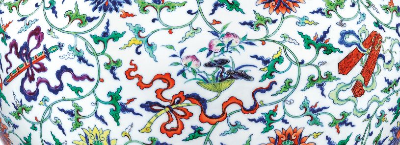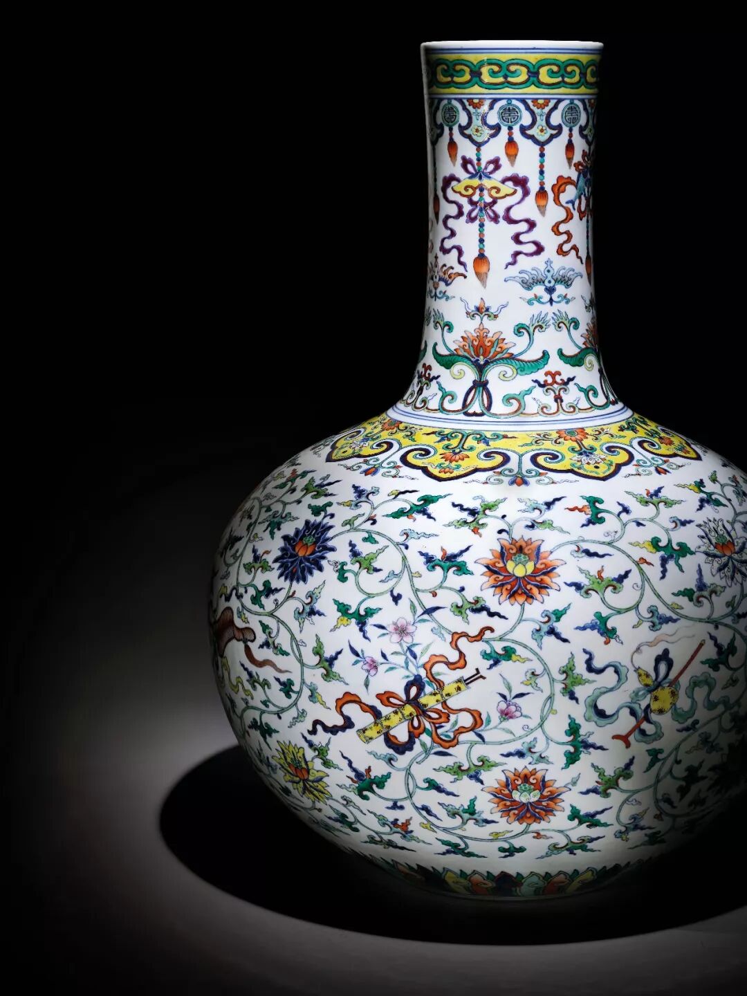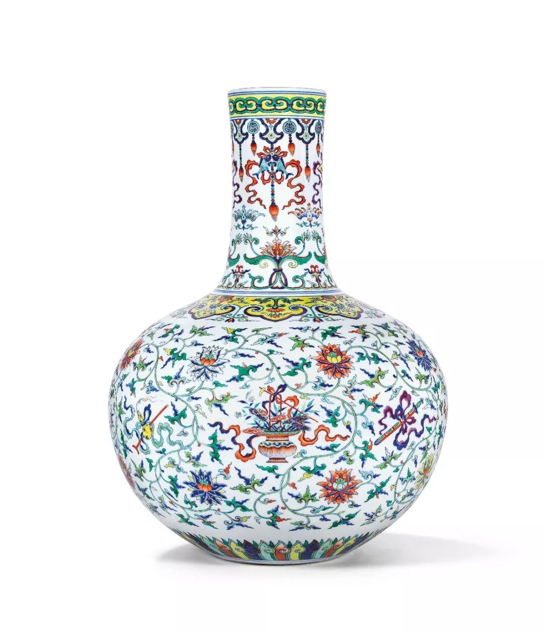此天球瓶,是清乾隆御制的精采绝伦之作,该作品绘以暗八仙纹,代表道教传说中八仙的护身法宝。