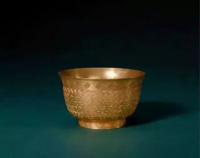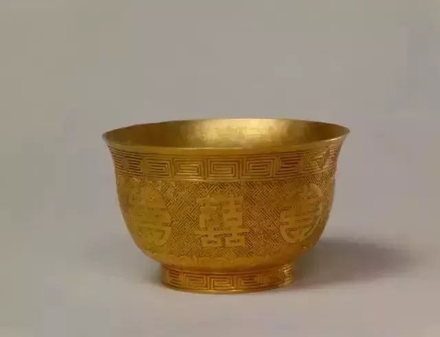 此茶碗制作工艺精致,錾刻的纹饰与字体规整、优美,为清代晚期宫廷金质藏品中的珍宝。此类金制品即使在清宫亦非皇帝日常所用。它是按照《大清会典》要求的式样制作,并按照国家制度仅在皇帝大婚、万寿等典礼中使用。