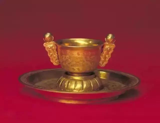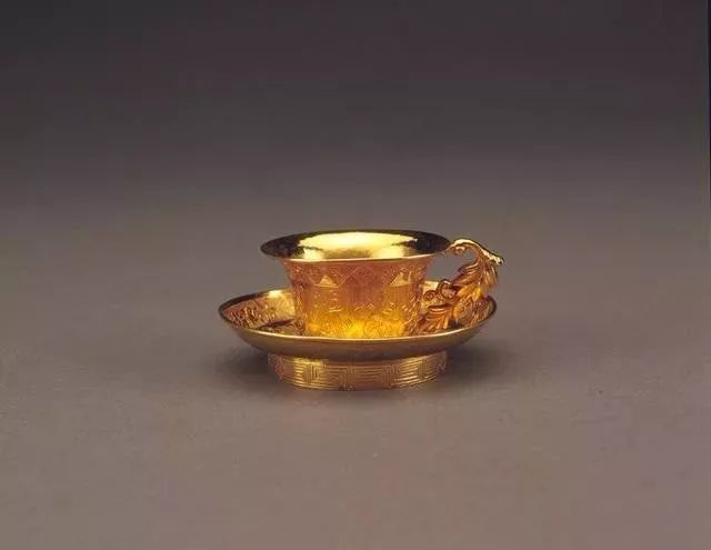 这套金质杯盘为清宫内务府造办处所制,豪华富丽,是宫廷举行大宴时供皇帝使用的。带有“万寿无疆”赞词的清代金质酒杯目前还很少见。