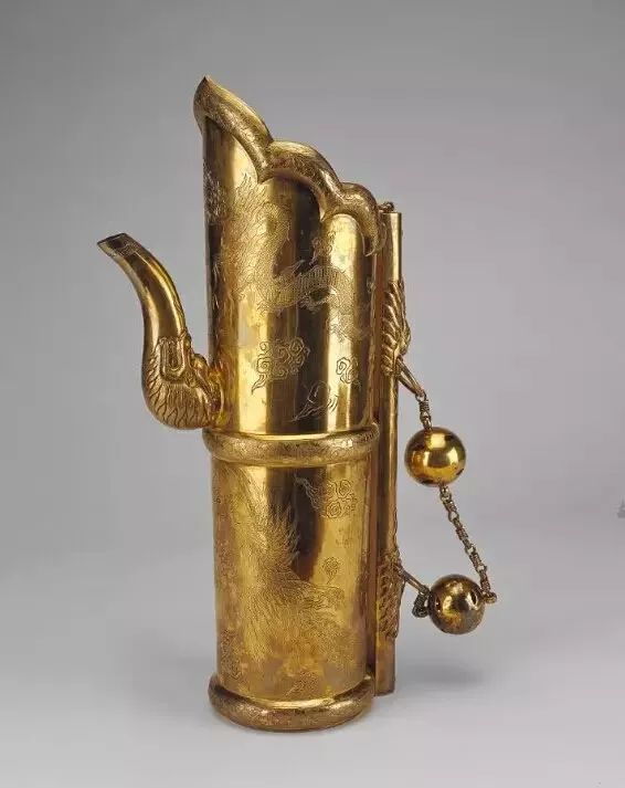此壶为银质鎏金,刻有“大清乾隆年製”六字,盖下口近缘处铸卷浪纹。