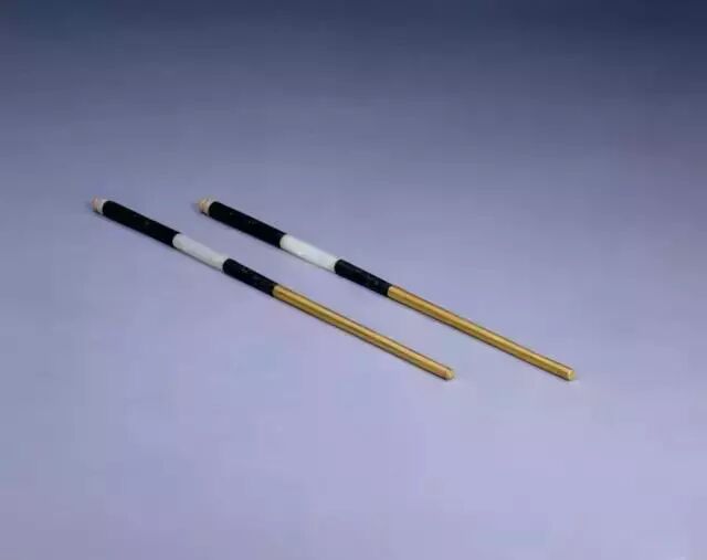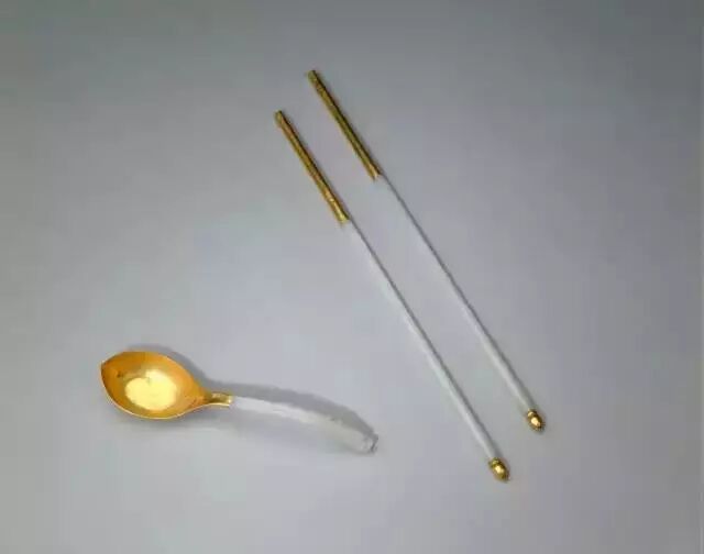 清代后妃用餐具。青白玉制成,筷子上部饰竖棱纹,顶端、中部和下部镶金三处。顶端为尖顶形,中部为凸环纹八道,下部光素。金为赤金,成色上佳。