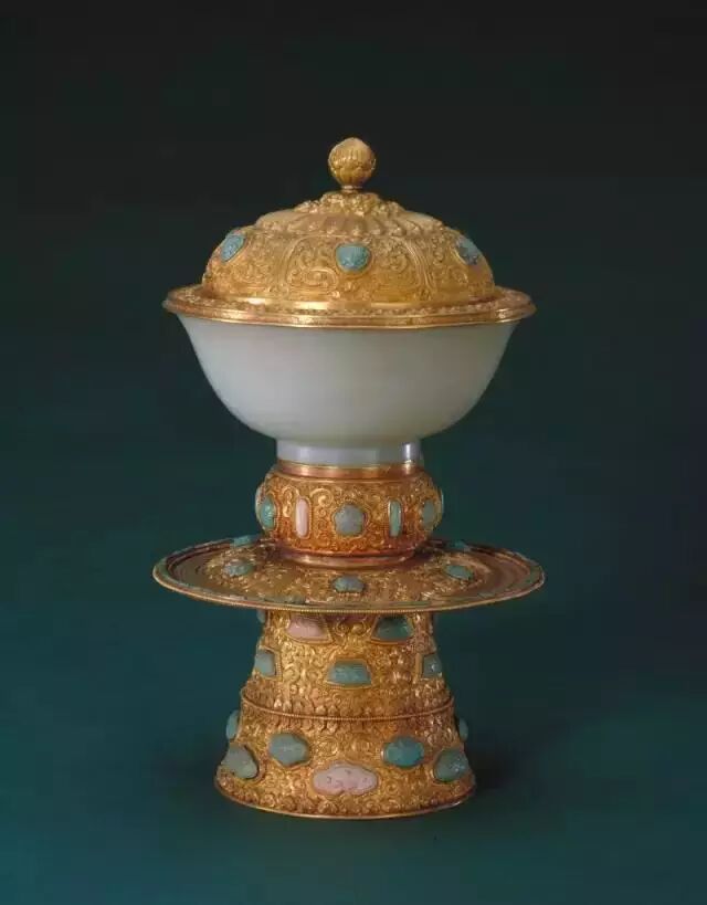 清代宫廷使用的盖碗种类很多,金、玉组合的作品则较少。这件盖碗的金工精致,玉质绝佳,托、盖、碗浑为一体,既实用又有很好的陈设效果。