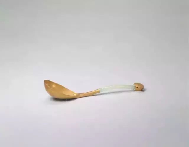 羹匙为九成金制,是宫廷饮食器具之一。匙体光素。匙柄为青玉制,柄端镶嵌金如意。