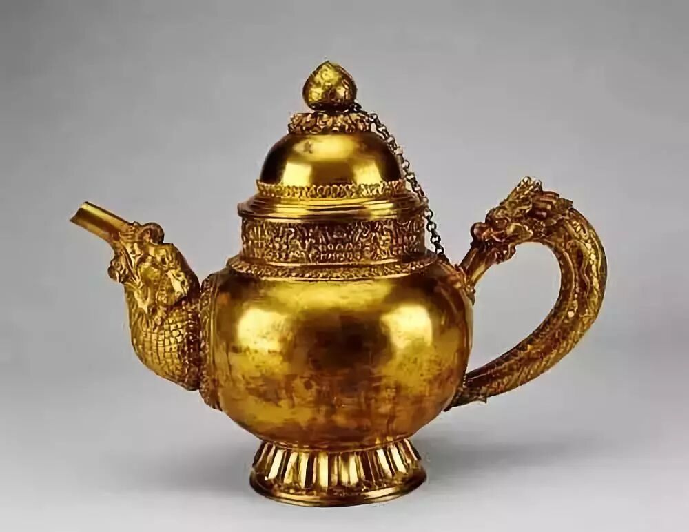 此执壶造型优雅,线条流畅活泼,錾刻的纹饰极其精细繁复,金色的质地与精美的纹饰相得益彰。此种执壶即可陈设也可使用。