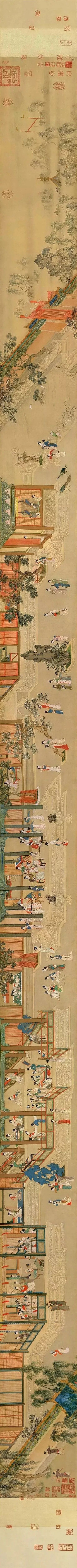 《汉宫春晓图》是中国十大传世名画之一,中国重彩仕女第一长卷。明代仇英作,绢本重彩,纵30.6厘米,横574.1厘米,现藏于台北故宫,作为装饰性绘画来说属于巨制。