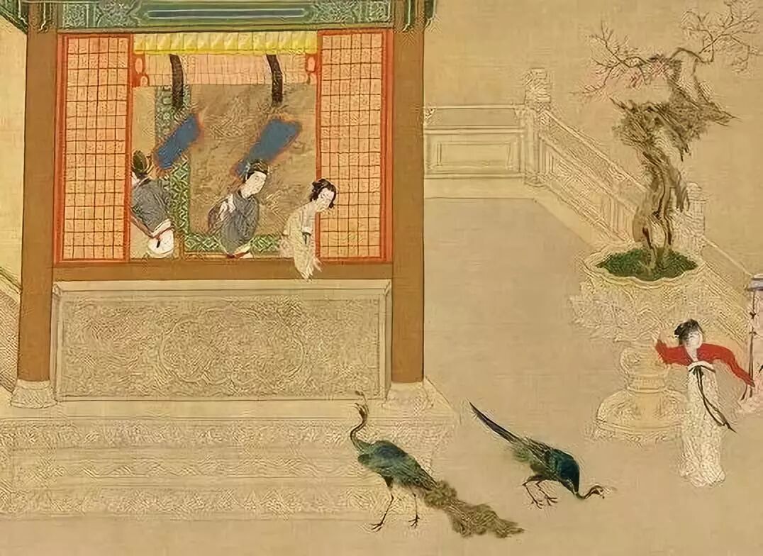 身后的宫苑中有位仕女在给孔雀喂食