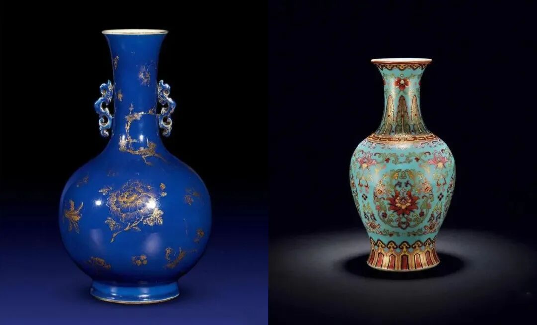 由于明清时期的彩瓷得到空前的发展,工匠们已不满足于传统陶瓷单一的色釉装饰,开始用纯金加工提炼的金粉,在豆青、祭蓝等颜色釉瓷器上描金加彩,进行装饰。