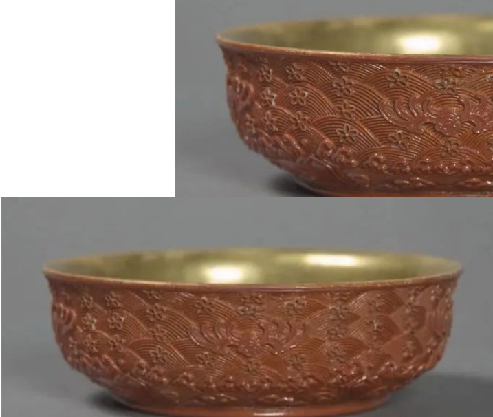 明清的景德镇御窑厂常用描金装饰颜色釉瓷器,如著名的宣德鲜红釉描金器、弘治黄釉描金器、乾隆窑变釉描金器等。