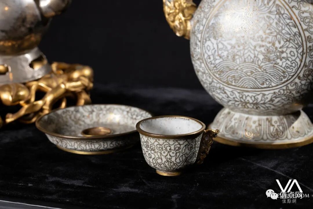 铜胎掐丝珐琅(俗称景泰蓝)制作的一件,盖钮鎏金与短桥饰鎏金羔羊,流底则鎏金錾刻源自印度神话的摩羯。壶身正反面饰滴露形开光,内饰海水江崖、松、竹、鹤、方胜、灵芝、蝙蝠纹,代表高尚、长寿、福到等中华传统寓意。执壶以白料珐琅为地,与鎏金掐丝对比鲜明,杯盏又难得地原装保留。