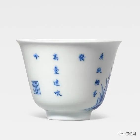 清宫每月举办各式宴会,王公大臣喜欢用使十二花神杯饮酒行乐。每杯代表一个月令,上绘相应花卉作装饰,兼写有唐诗衬托。这一件是七月兰花,上书「广殿轻发香,高台远吹吟」,出自唐代宰相兼诗人李峤的《兰》,全文为「虚室重招寻,忘言契断金。英浮汉家酒,雪俪楚王琴。广殿轻香发,高台远吹吟。河汾应擢秀,谁肯访山阴。」