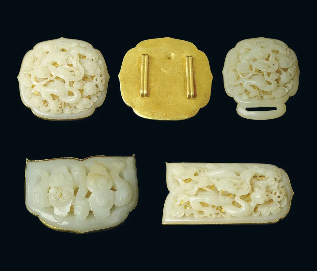 ↑元末明初,云龙纹镶金玉带饰,南京汪兴祖墓出土