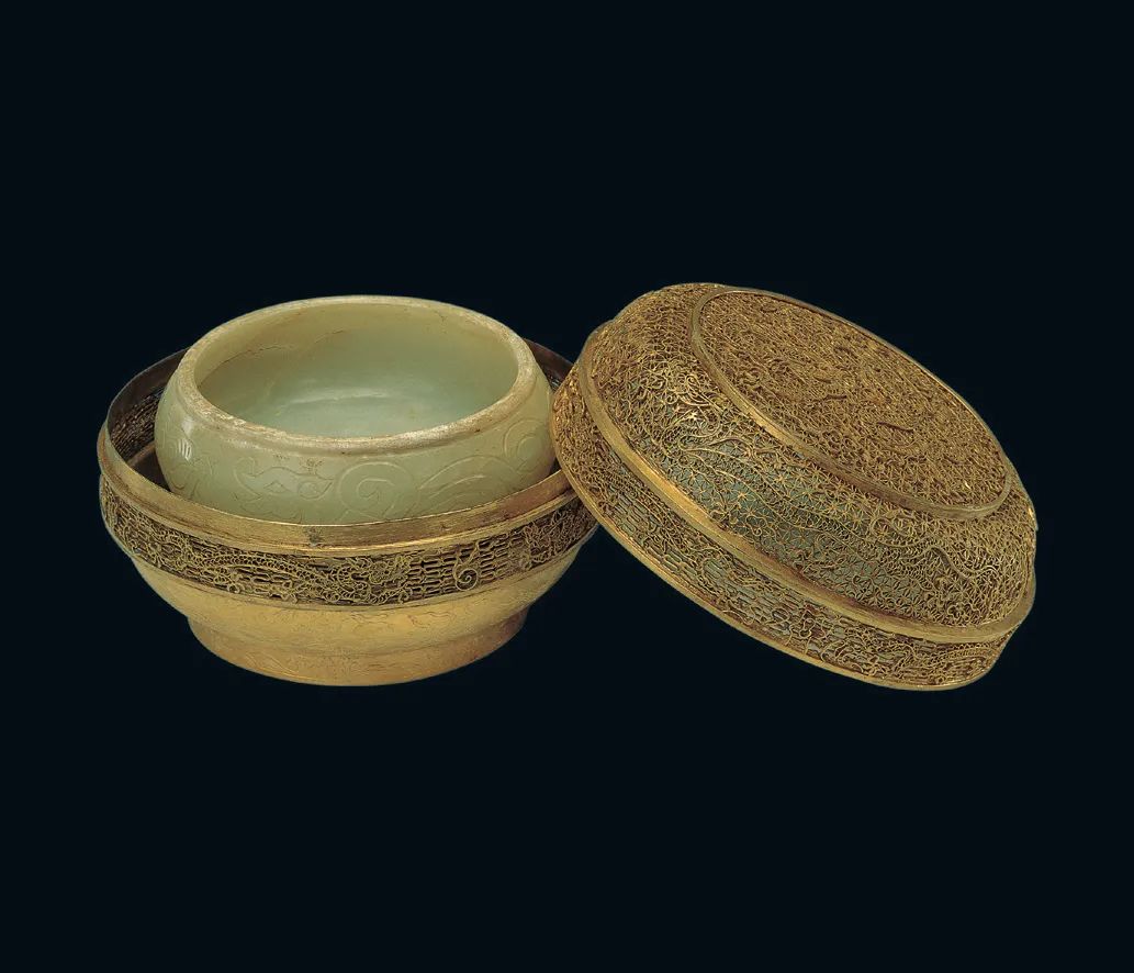 ↑明代,金盖金托玉碗,定陵出土