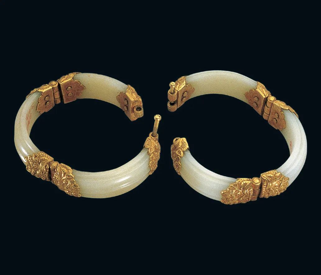 ↑唐代,镶鎏金嵌宝珠玉镯,西安何家村窖藏出土