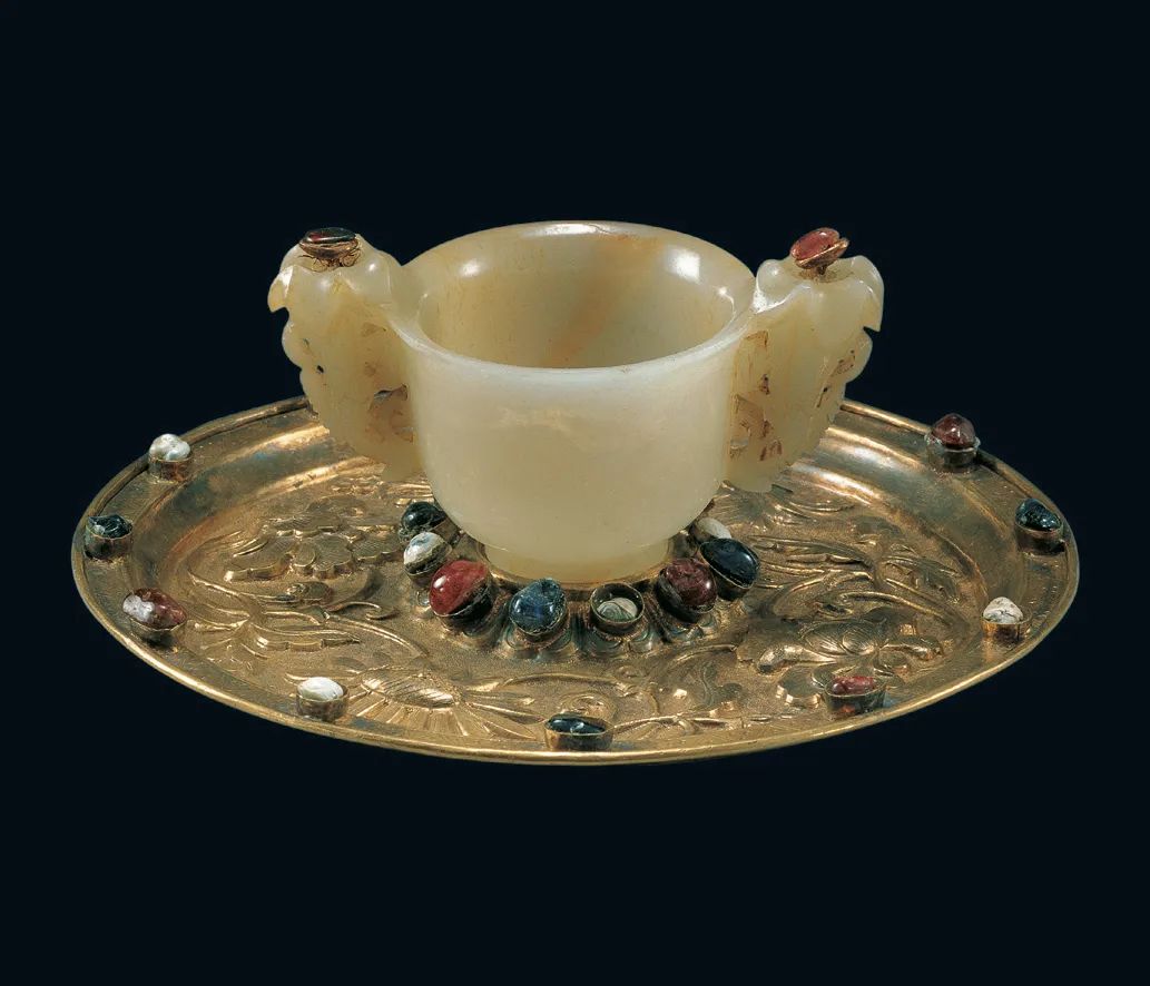 ↑明代,鎏金银盘玉耳杯,定陵出土