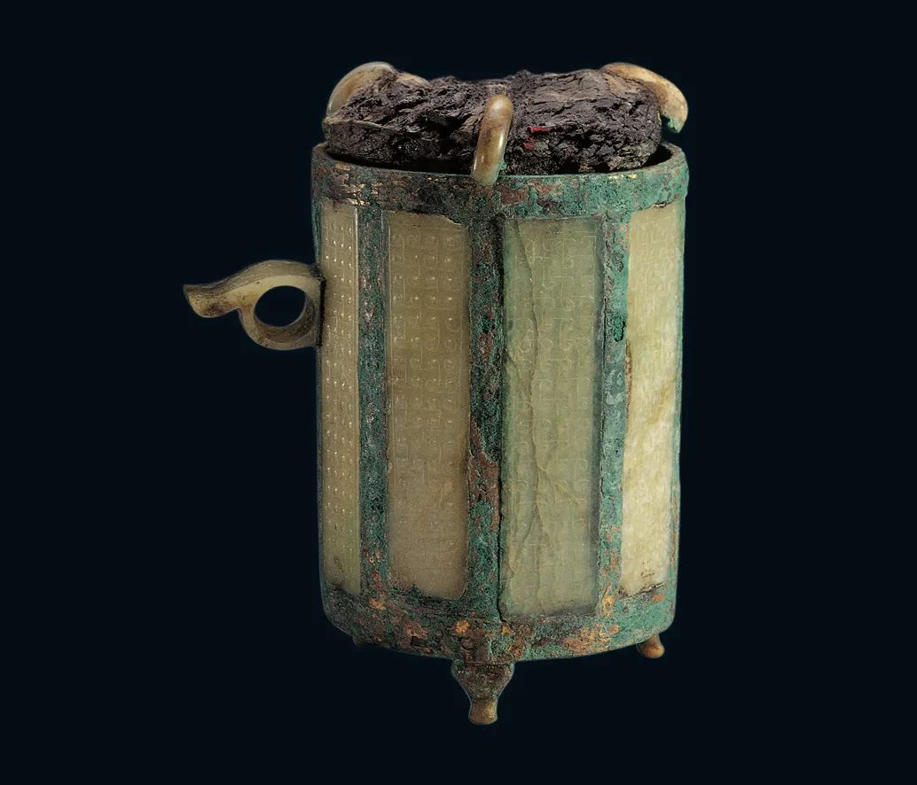 ↑战国末期,铜框嵌玉酒卮,广州南越王墓出土