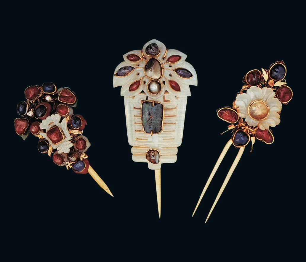 ↑明代,镶玉宝石金簪,定陵出土