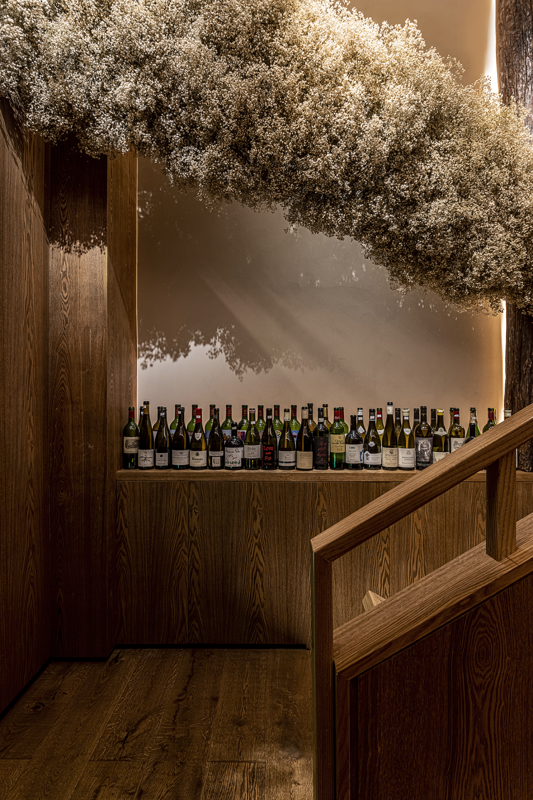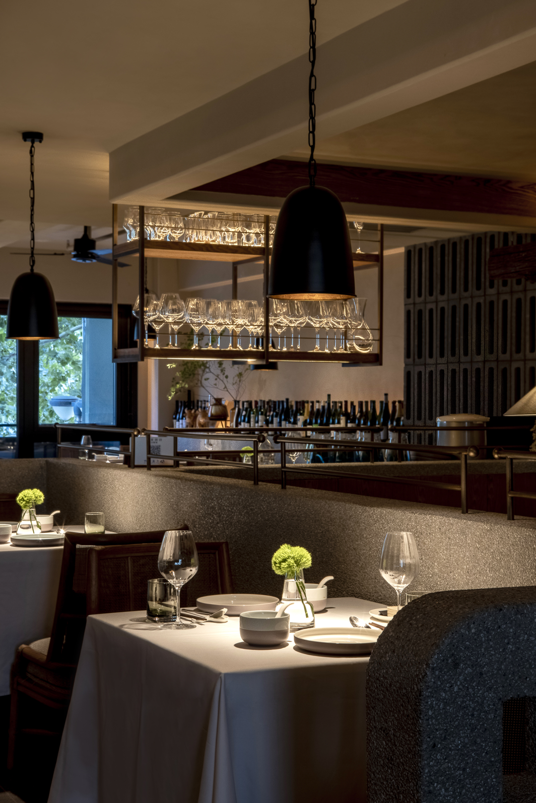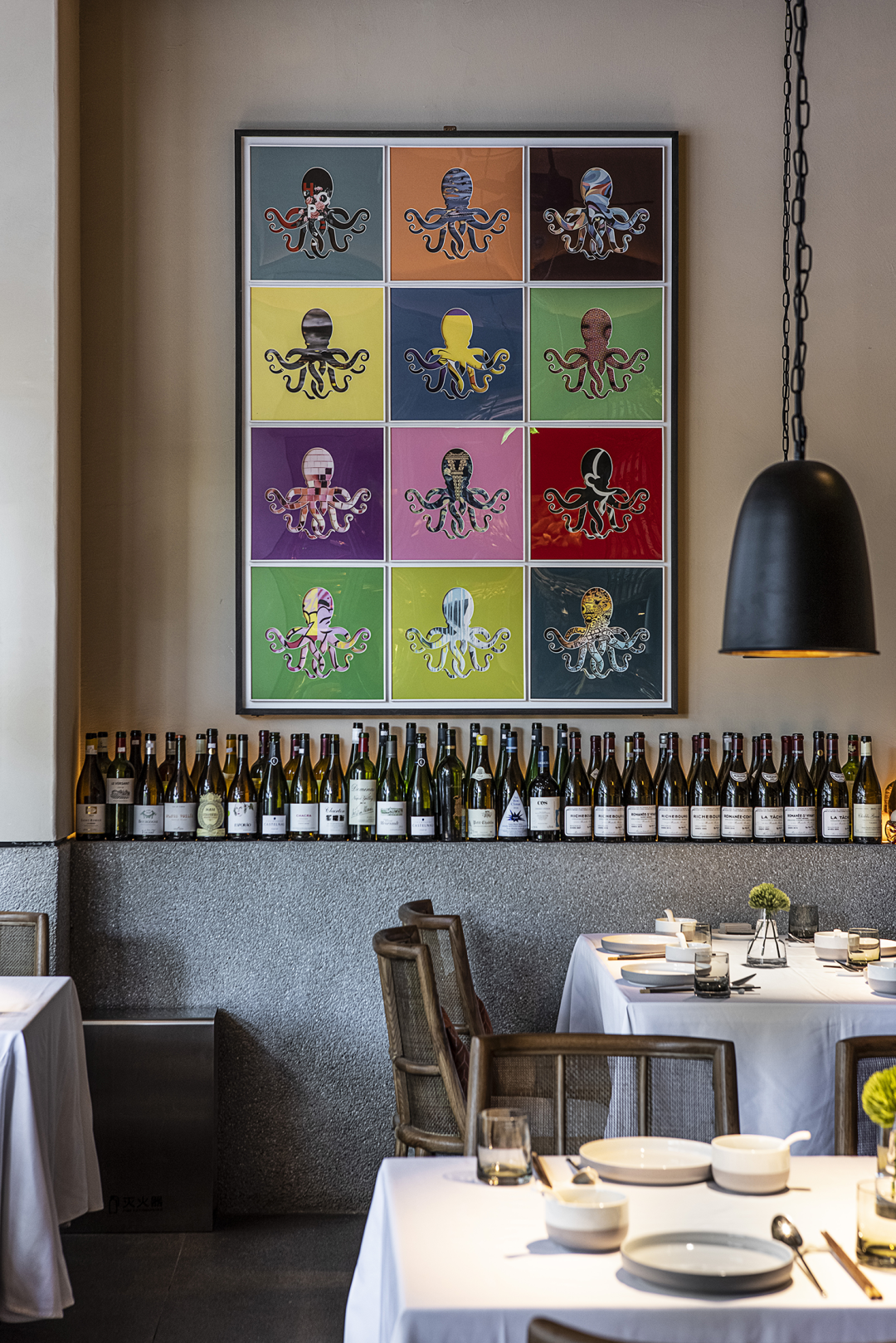 以平凡之物造境触发全新感受,设计中的巧思就此体现。延墙的酒瓶,凸显出“食酒文化”主题,看似随意摆放,却经过深思熟虑,为空间注入了活力,自然的分割过渡中,透露出真实的生活气息。