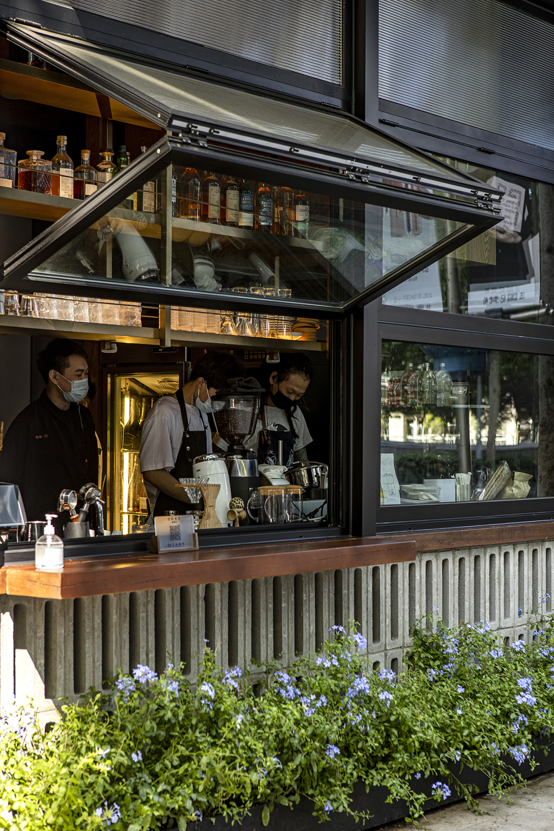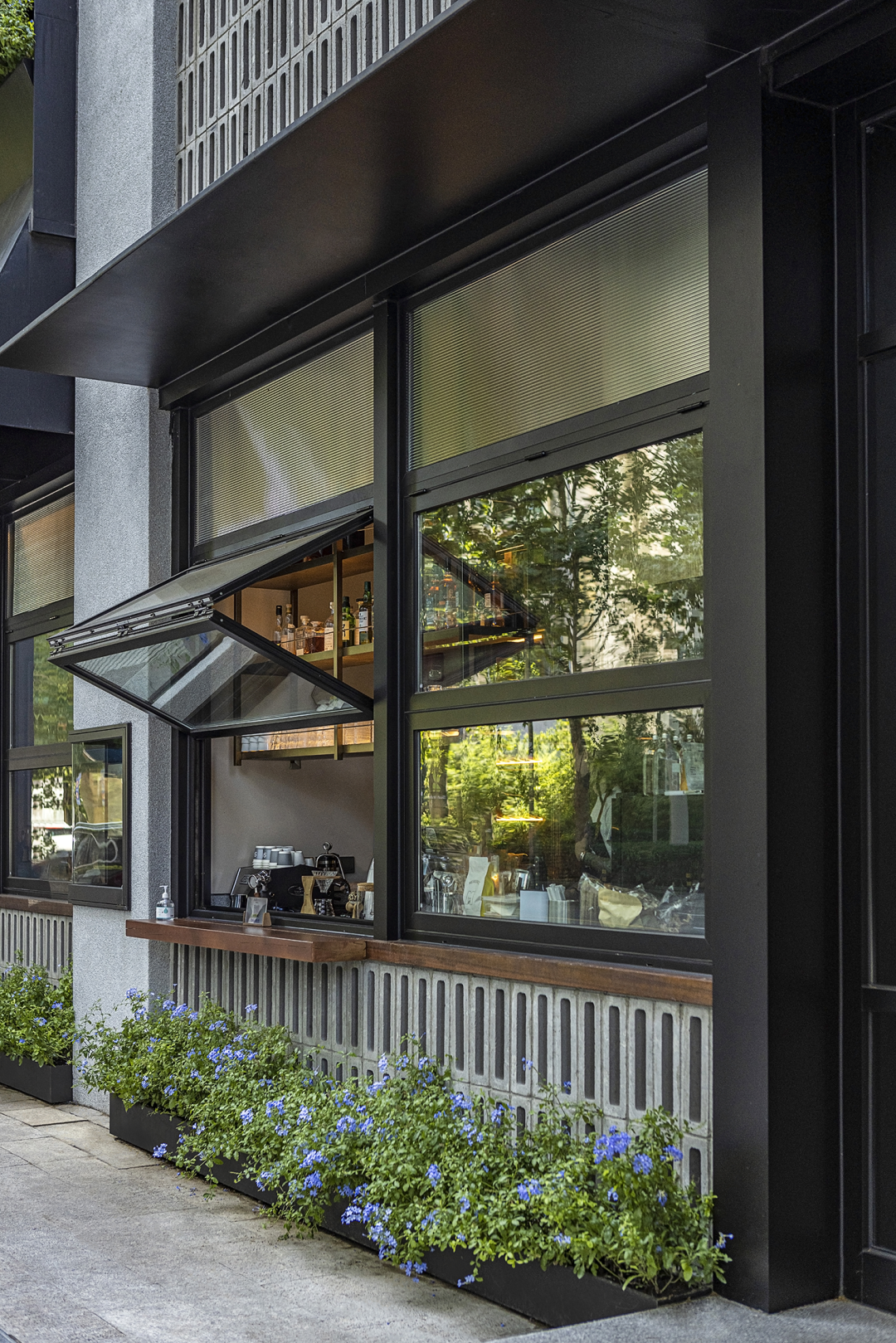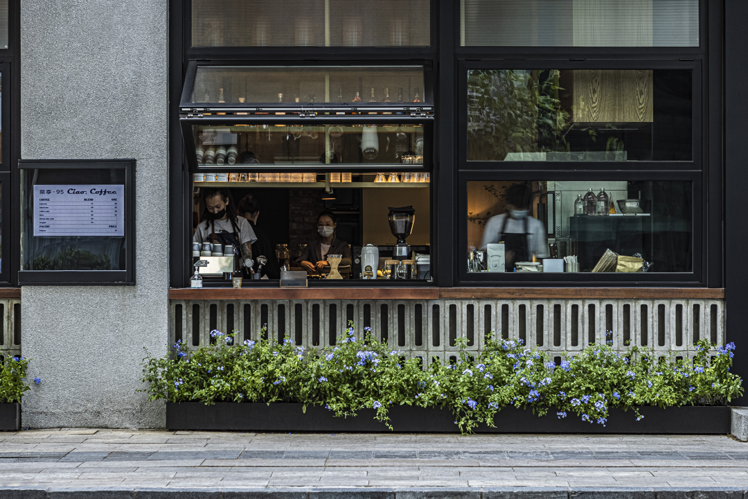 建筑立面经过重新改造后,以天然质感呈现出一家让人忍不住想要去靠近的小馆,友好的互动从门外驻足的那一刻便开始了。上挑窗开启后,变成为售卖咖啡的窗口,为人们增添了一处与城市相处的通道。阳光穿过树荫,斑驳的光影打在窗户上,自然的生机伴着咖啡的暖意,足以为一整天的繁忙补给能量。