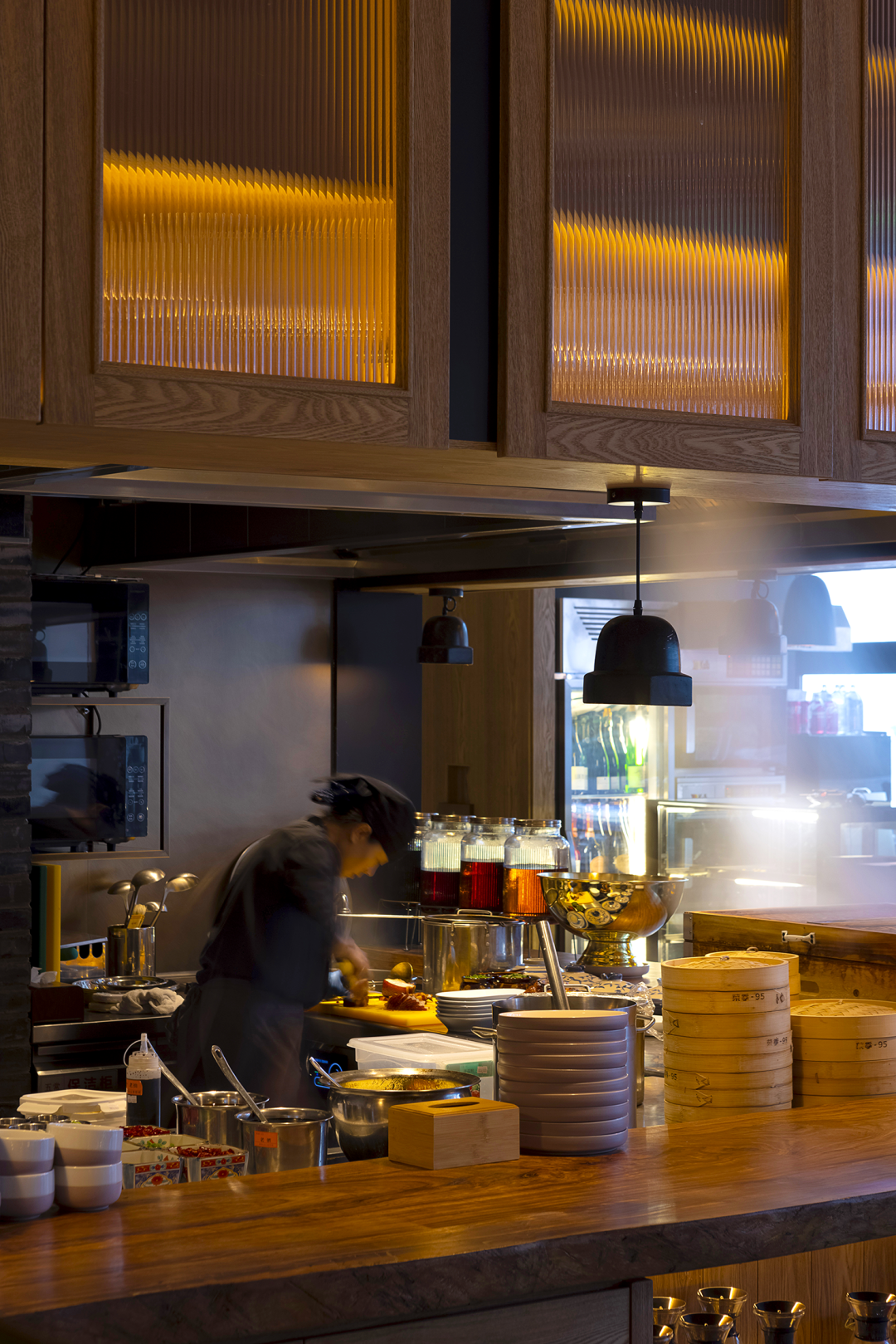 随着空间的深入,设计师有意做了暗场,灯光浮动之间,依然能看出曾经路边排挡的影子,在深木色的空间中,人们聚焦于眼前的美味,分享着一天琐碎,光影、食物、记忆交织在一起,弥漫在热气腾腾的深夜食堂。