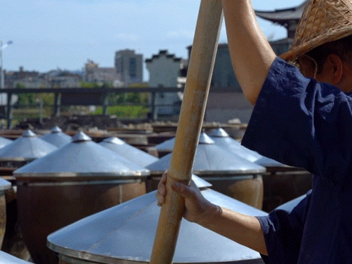 在晒露的过程中,每隔几天,薛师傅都要进行“捣缸”。用木棍不停地搅动发酵缸,使缸内的物质均匀晒熟,呈红褐色,产生浓烈的酱香味。