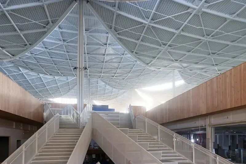 此外,这个巨大的帐篷般的屋顶架构不仅有遮蔽太阳、雨水的作用,还有透过外部风流调节室内气候、空气质量和声音的作用。