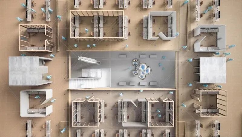 上层的专注区被分成更小的社区,可容纳 40 到 80 人的社区,设计团队借鉴了核心城市规划原则,将这些社区由独特庭院隔开,融入艺术作品,并通过室内路线(主干道到小巷道)将这些社区连接起来。