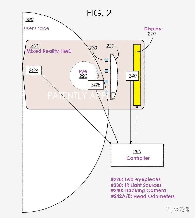 苹果公司的专利图2说明了一个VR/AR HMD的例子,它实现了一个眼动追踪系统,包括检测HMD相对于用户眼睛的运动的传感器。