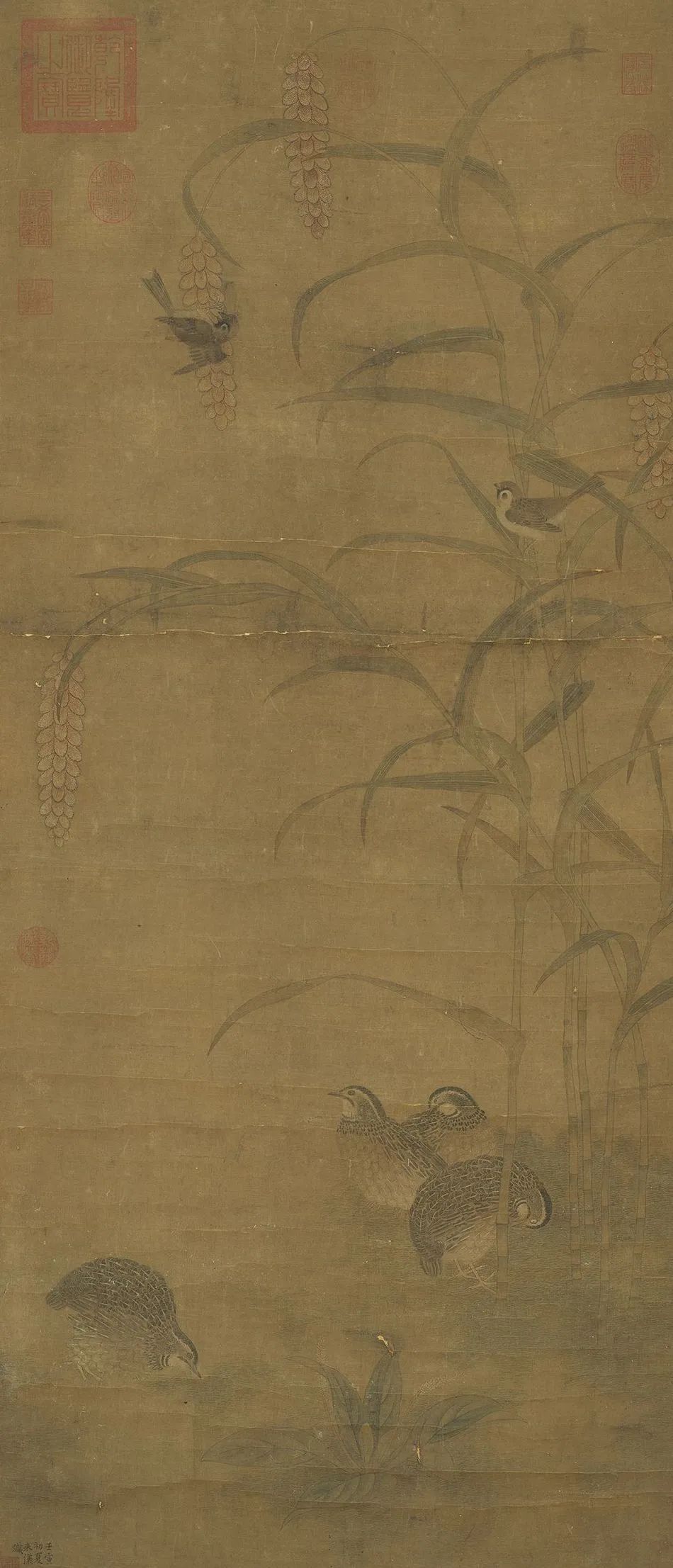秋郊野地,草叶转于枯黄,野生的数茎高粱,禾穗累累,已是秋收的季节了。茎叶之下,五只鹌鹑游憩其间,另有文鸟四只停栖于上,或理羽,或啄食禾粒。