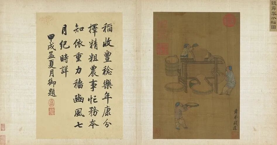 清仁宗行书御题:稻收丰稔乐年康,分择精粗农事忙。务本知依重力穑,豳风七月纪时详。甲戌(1814年)孟夏月御题。