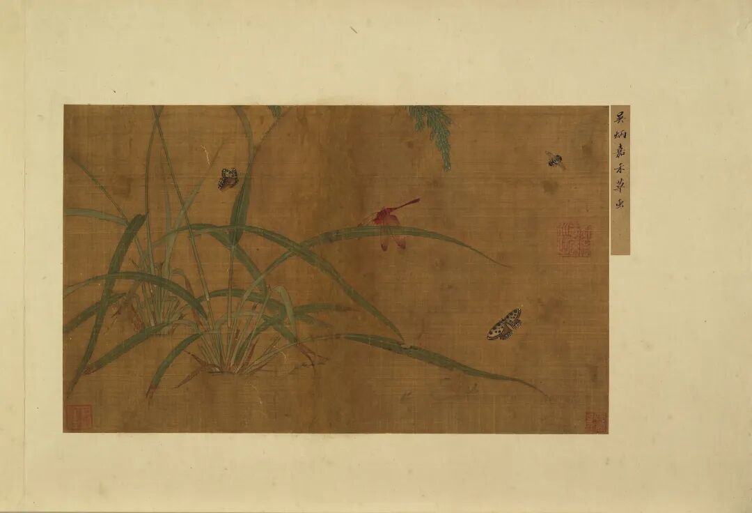 蝴蝶、花虻和蜻蜓,有的兀自在空中飞舞,有的则栖息在叶梢。由于右上方的叶子,和上方的稻穗,均溢出了画幅的边界,推测可能是表面曾经遭到污损,才由大裁小,改装成现在所看到的形式。
