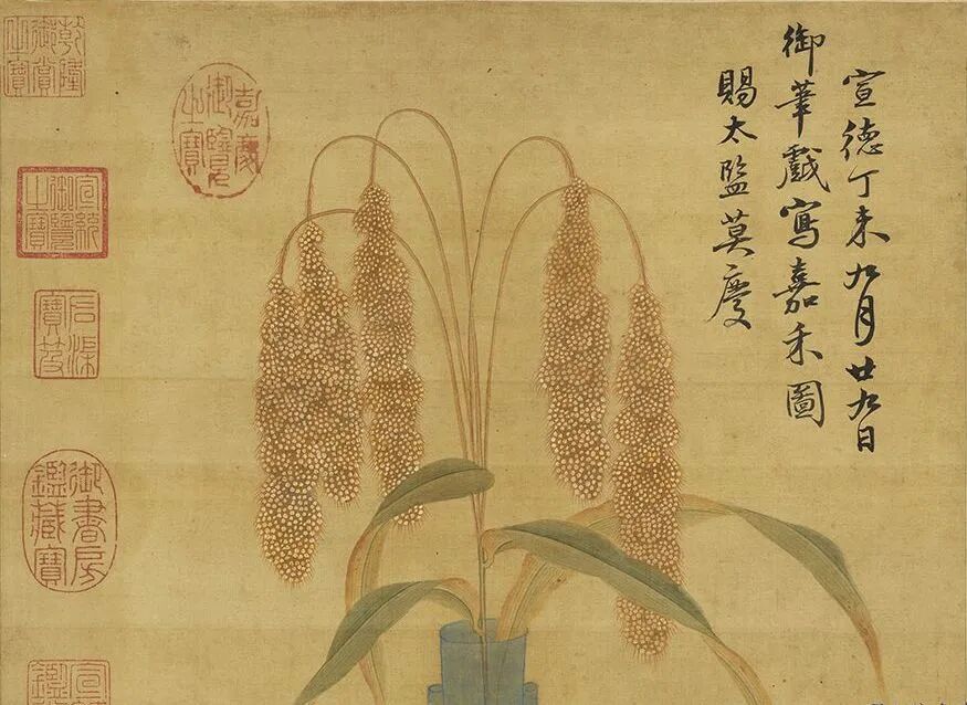 历代书画不乏以禾穗、高粱、稷米等谷物入画,庆祝丰收,以表吉祥寓意的名家画作。如宋人《安和图》轴写数茎高粱,禾穗累累,构图笔法精严,各物皆栩栩如生;元人《嘉禾图》轴绘稻生双穗,构图非常单纯,主题强烈,有着简朴而新顷之感;清代蒋廷锡的《画四瑞庆登图》轴则画两棵高粱结满穗粒,虽用笔工致,但不板滞,兼有写生之趣。