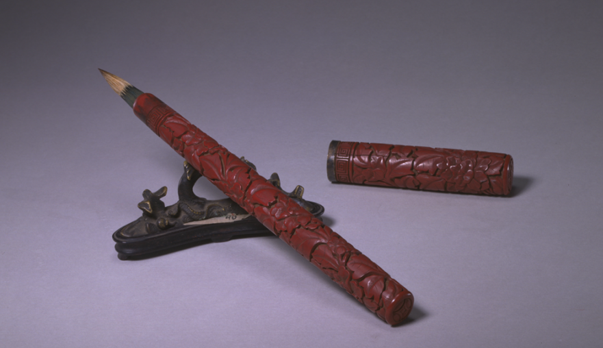 明   剔红牡丹纹管兼毫笔  长18.9cm