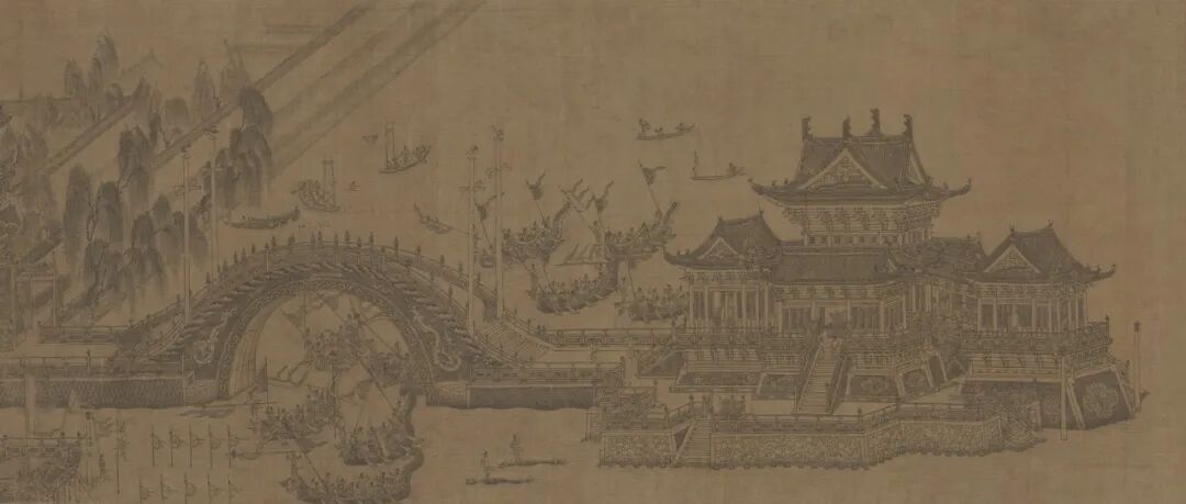 此图绘北宋宫廷在金明池举行龙舟夺标的场景,是宋元时期水嬉的缩影。北宋宫廷一般于三月举行龙舟水嬉活动,《东京梦华录》中有较为详细地记述。图中界画精整,纯用白描,表现出宫殿苑囿及龙舟的瑰丽巍峨,此外尚有水秋千等游戏,池中有小龙船、飞鱼船、鳅鱼船等,蔚为大观。图中人物虽小,但为数众多,形态动作多样,或竞渡、或水嬉杂耍、或演乐、或侍立,细节丰富,足资考证。