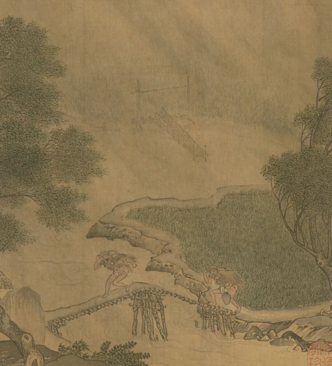 此选自《四朝选藻•贞册》第八开,表现夏季大雨骤降、农夫仓皇回家的场景。图中人物线条简练,但情态生动,陂岸坡石用“斧劈皴”,用笔劲健,畦田树叶画法细致,布景空蒙,令观者如置身烟雨之中。画幅左下有作者款题“东村周臣”,钤“周臣印”白文印。