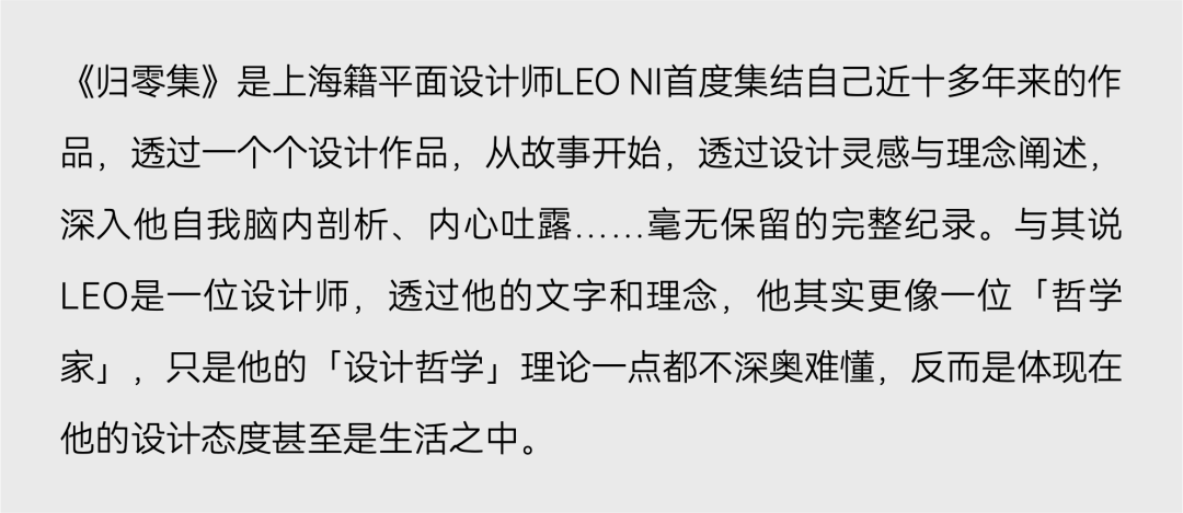 Leo这本书是我对自己过去设计的一个整理。一个人的人生根本无法简单地用数字去编排,这6个章节的划分更多的是一种象征,有很多内容我至今还没有能够在记忆层面还原需要进一步地整理和思考,有些细节我甚至完全忘记了,有些并不适合公开呈现出来。