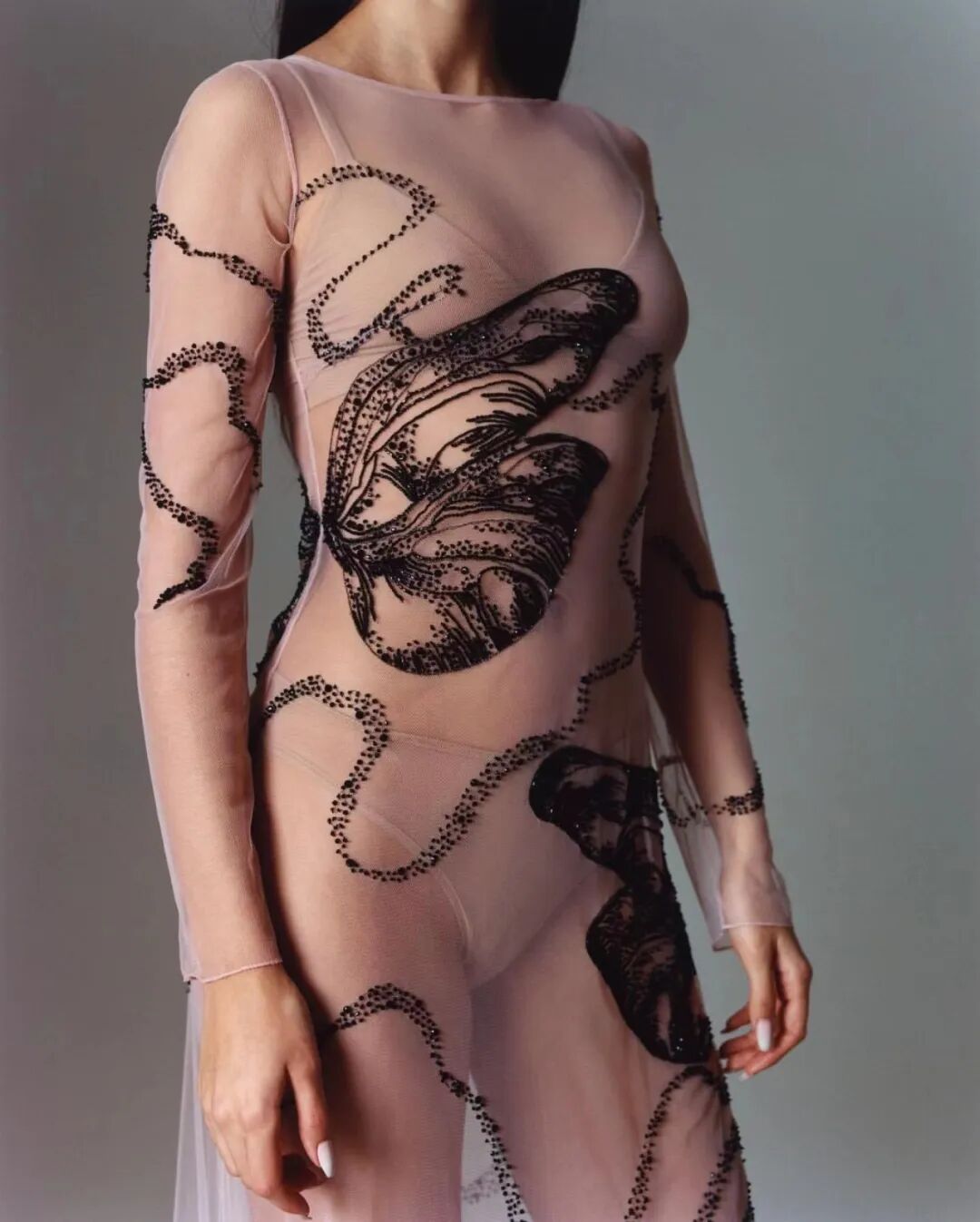 2022秋冬系列以蝶蛹为主题,通过刺绣和别样的珍珠、印花表现出独特的女性气质,还带着一丝黑色幽默。