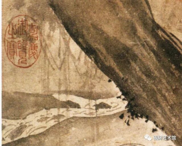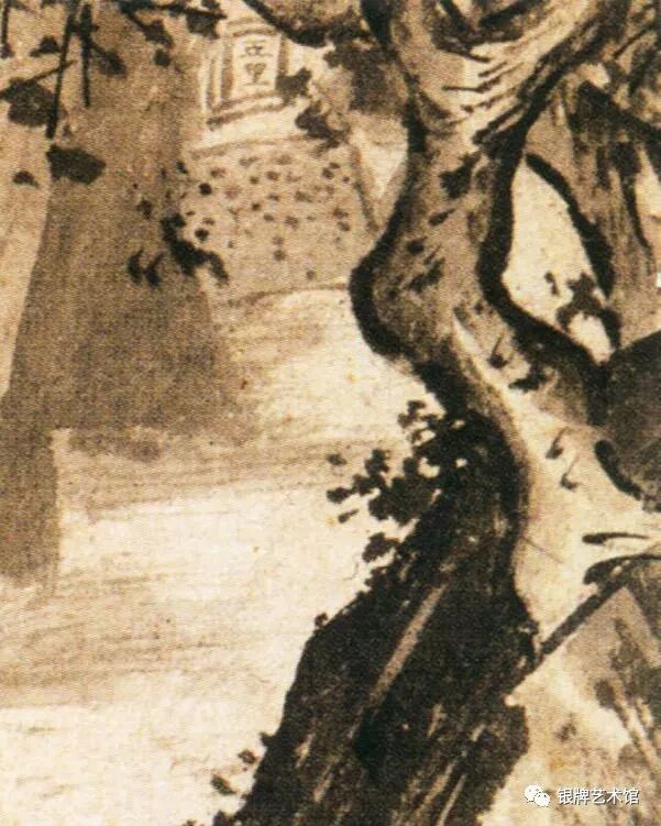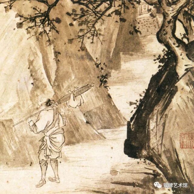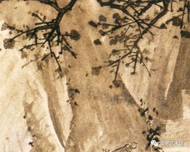 近景突兀的巨石与偃斜的虬枝用笔粗放、肆意,与远处水口、人物身后的岩体以淡墨渲染相烘托,很好地营造出“熹光初显人烟少”的清幽氛围。