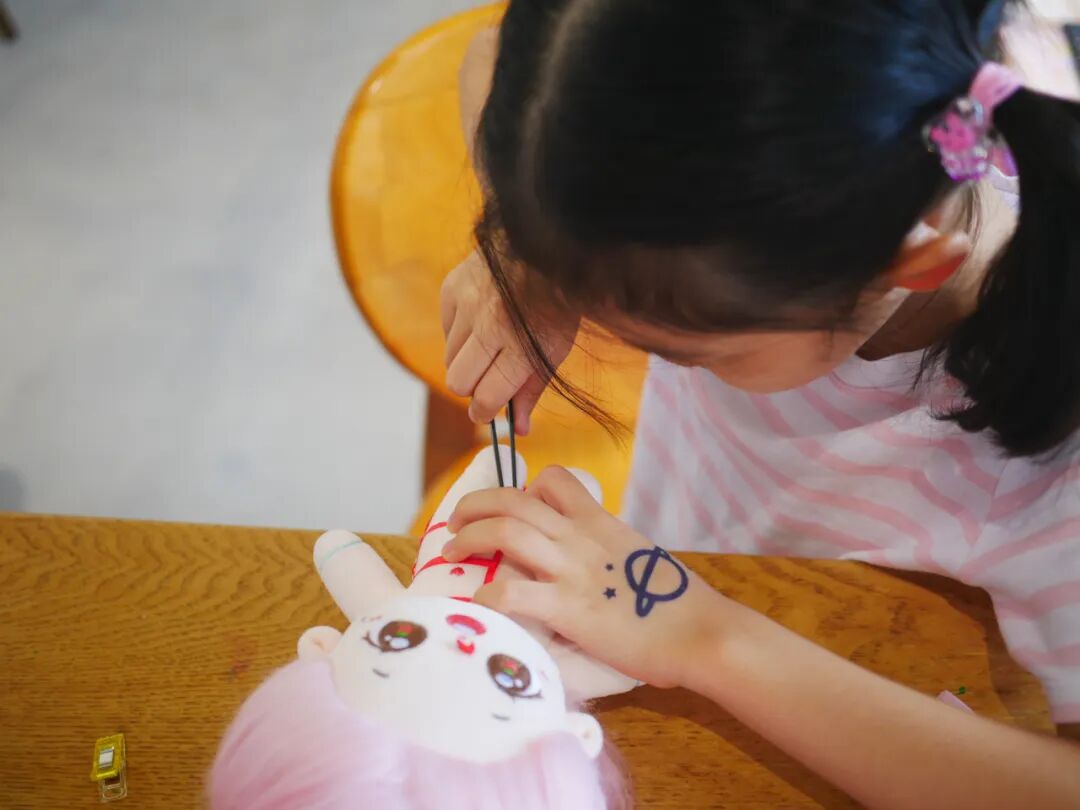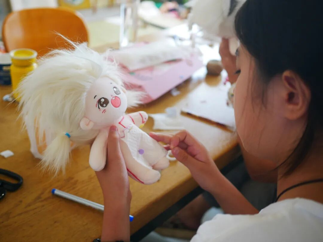 大梅在家中教小朋友做布偶