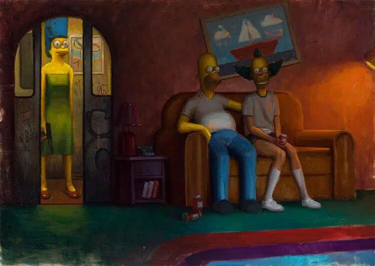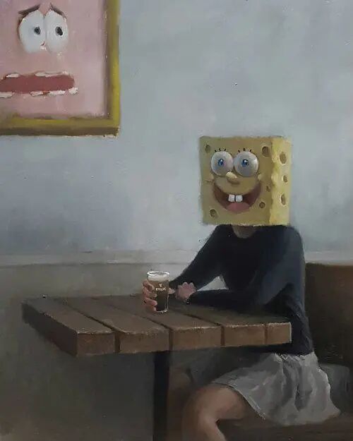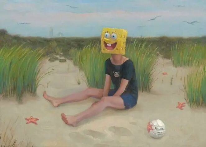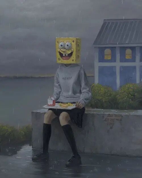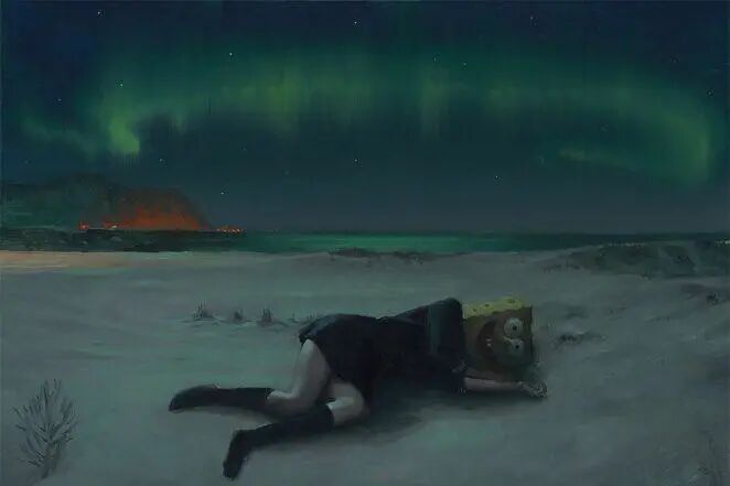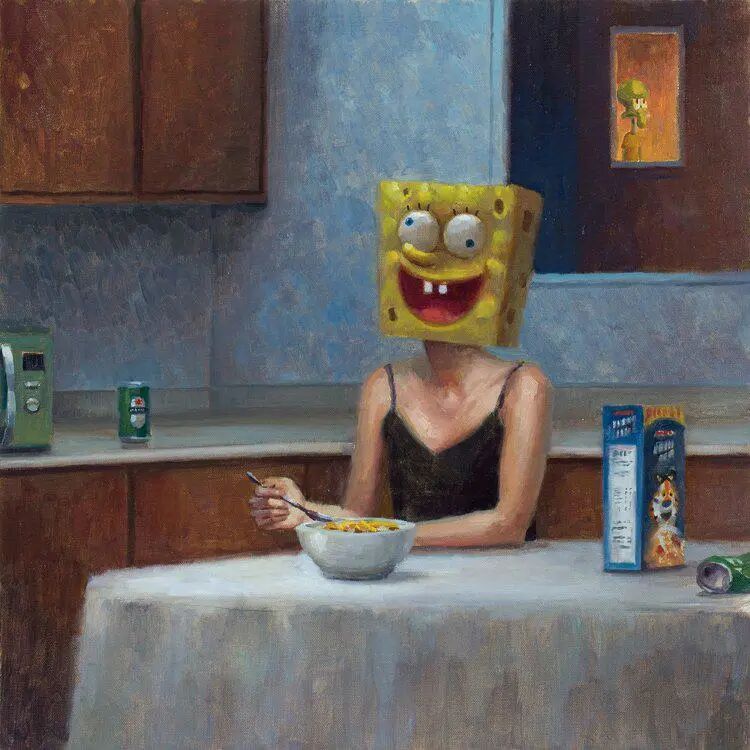 古力根的暗黑超现实主义画作,还经常与流行元素和都市元素结合在一起,比如将女性的头部,换成海绵宝宝系列,让人感觉诡异又荒诞,这位艺术家直言,海绵宝宝单纯快乐的脸,与他的绘画中荒诞和黑暗的气氛,形成了鲜明的对比,这样的对比能够唤起更多的不和谐感。