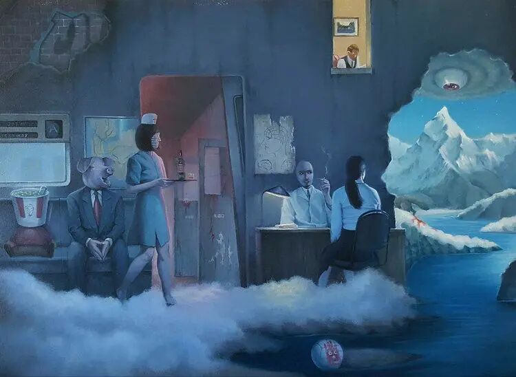 “我的创作意图是营造氛围,而不是讲述故事,我只是简单地将脑海中的图像复制到画布上而已”。因此,我们在看古力根的作品时,会觉得无厘头,是因为这些作品本身就没有连贯的主题,或者遵循的逻辑,就像睡眠中做的梦一样,它不是一个完整的故事,而是某些碎片的拼接。你记得的,只是梦境带给你的情绪感受,而非梦中所发生的一切。