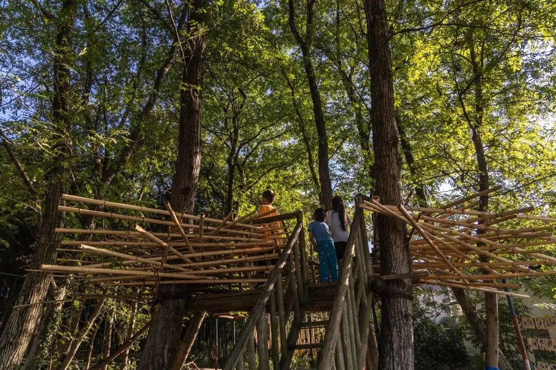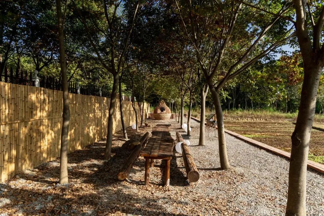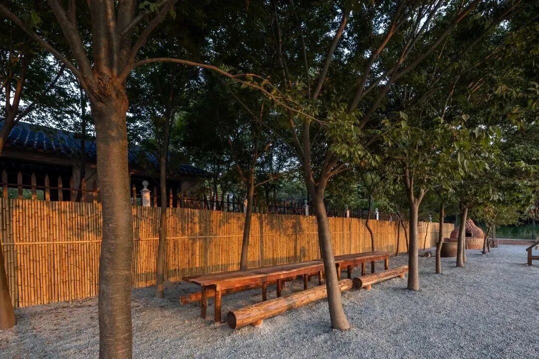 建筑景观设计可就地取材,利用乡土材料结合现代工艺技法因材造景。砖瓦石材肌理丰富,青竹原木温润自然,既节省了材料,又不失乡村的质朴天然特色。