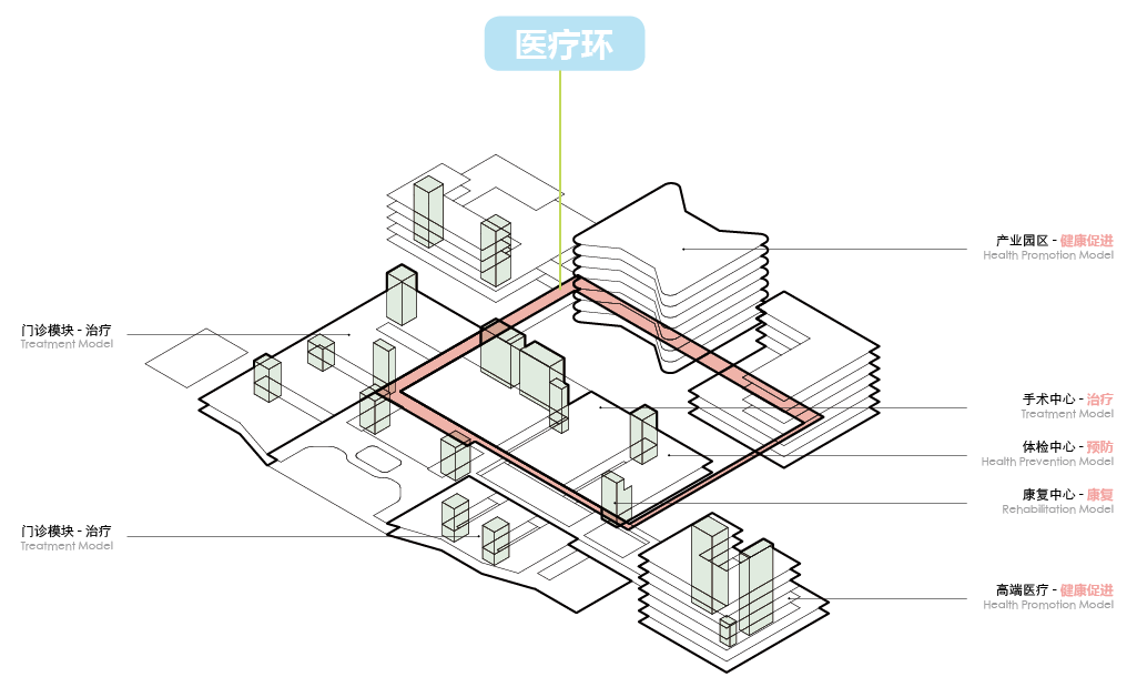 骨架交通中的水平交通流线为未来连接二期提供了可能。未来,一期二期相互连接可形成“医疗环”,即“预防→治疗→康复→健康促进”的良性循环周期,为生命全周期服务流程提供基础。