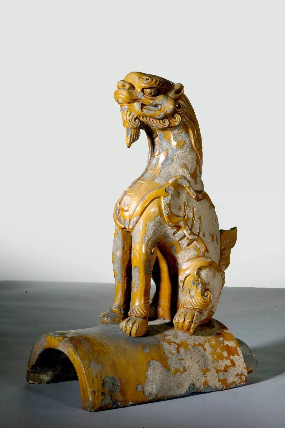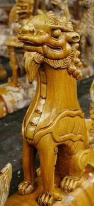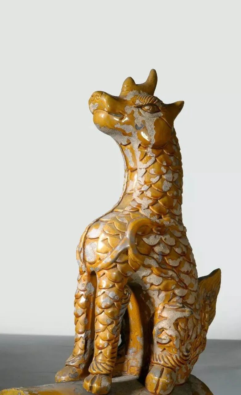 第三个是狮子。唐柳泌《玉清行》:“狮麟威赫赫,鸾凤影翩翩。”《传灯录》载:“狮子吼云:‘天上天下,唯我独尊。’狮子作吼,群兽慑伏。”狮子是百兽之王,把它放置殿顶具有勇猛威严的象征。