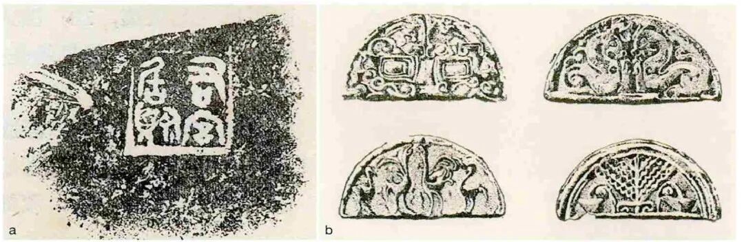9 战国半瓦当(a燕下都半瓦当印记拓本;b战国半瓦当举例)