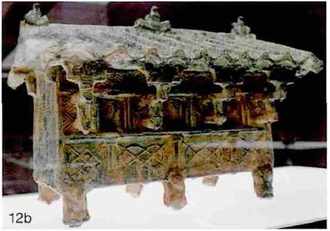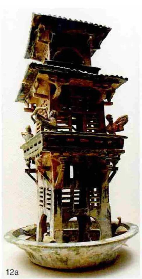 12 汉代建筑用瓦当和斗栱举例(a汉三层庑殿顶禽鸟御人陶楼,山西省平陆县出土,山西博物馆藏;b东汉官式谷仓明器,瑞士苏黎世瑞特堡博物馆藏)