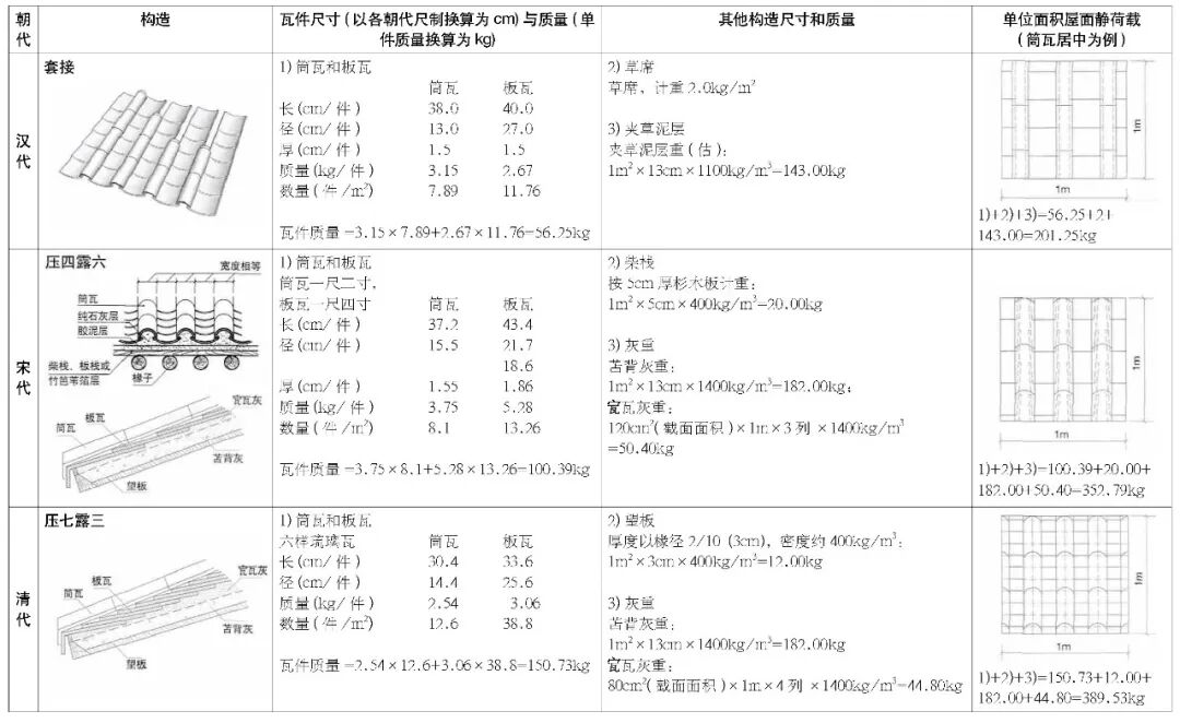 为研究瓦屋与木构的关联性,我指导年轻同事协助计算了汉、宋、清代的较高规格屋顶的单位重量(表2)8,总体而言,从汉代(早期)到有文献依据的宋代(中期)和清代(晚期)的高等建筑,屋顶是持续加重的。其因大致为:1)在构造上,瓦的铺叠加厚——早期的瓦有大小头之分,瓦与瓦之间套接或者用瓦钉将瓦和下部椽子连接,联系较弱;而宋代为叠压式,“压四露六”9[27](大部分瓦为二层重叠);到清代则为“压七露三”10[28]289(底瓦所有部分都为叠层,甚至部分叠为三层),如此屋面明显加重;2)瓦陇排列加密;3)每片瓦加厚,自重加大;4)泥灰加重:早期为草泥灰背,中期有望板和泥灰,晚期为望板(砖)和“苫背”11[28]31。所以以单位面积的屋顶科学计算数值可以推算出屋顶越来越重的事实(汉:201.25kg/m2,宋:352.79kg/m2,清:389.53kg/m2)。如此,从整个屋顶重量变化的角度出发,再考察诸如木构横架侧样的发展、或清代皇家建筑木构形制相对宋代的改变和柱梁等构件断面比例的调整,就变得顺理成章和更有逻辑,也为本文开头笔者认为目前缺少屋重而孤立研究木构提供了一个破局的思路。